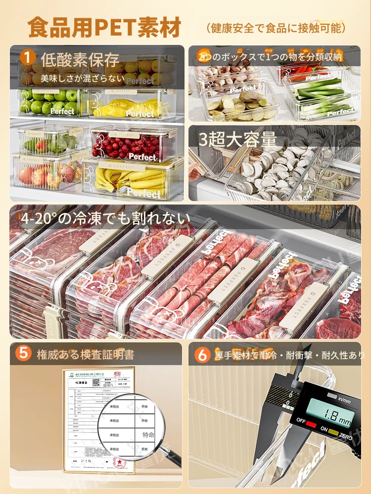 食品グレードの冷蔵庫収納ボックス - キッチン専用の野菜・果物冷凍密封整理ボックス!食材を新鮮に保ち、お弁当作りも楽々!整理整頓に最適なアイテムで、毎日の料理をもっと便利に!