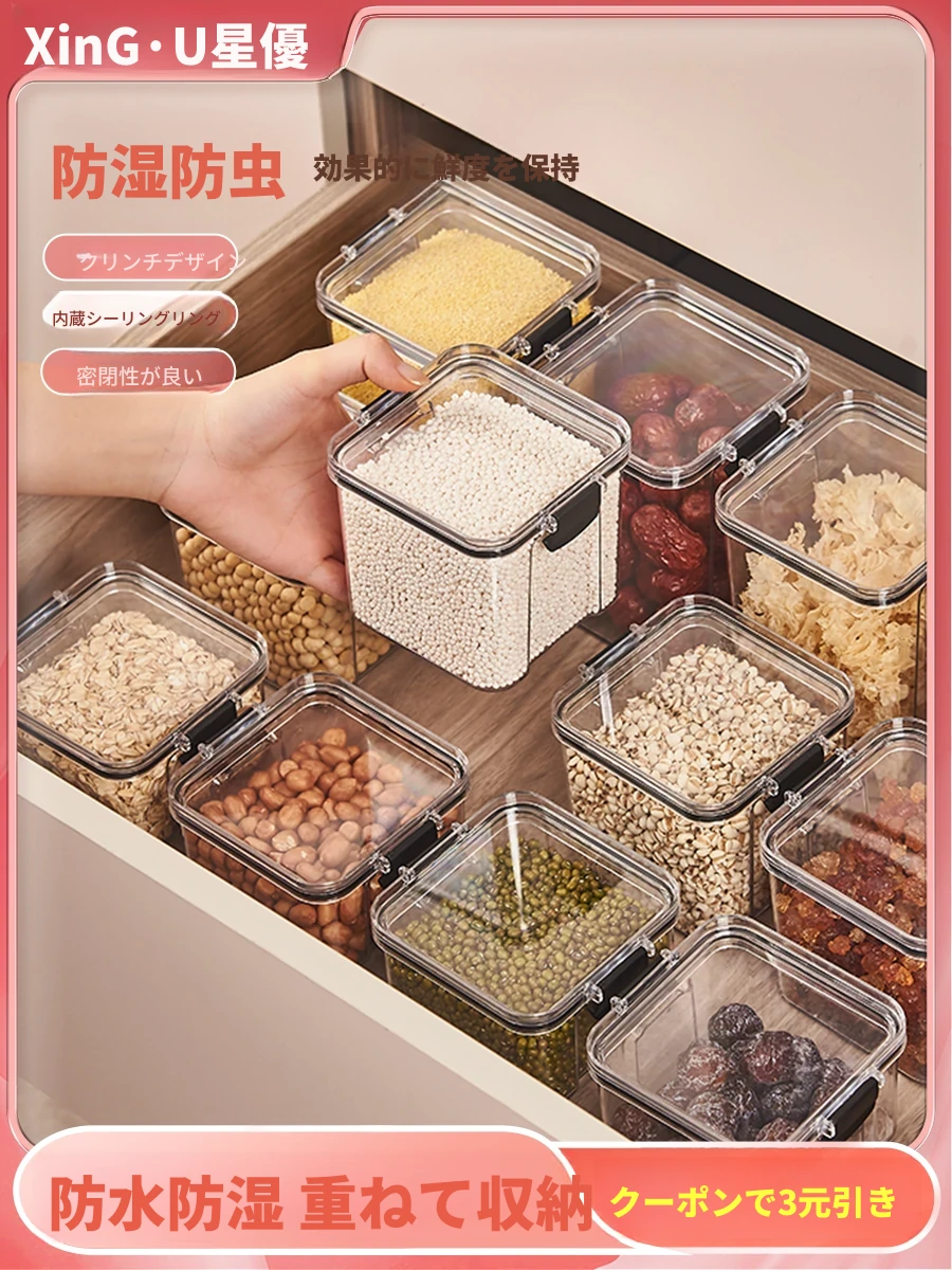 食品グレードの透明プラスチック密閉容器!キッチンで大活躍の五穀雑穀収納ボックス。お菓子や乾物、茶葉の保存に最適。すっきり整理整頓して、毎日の料理をもっと楽しく!