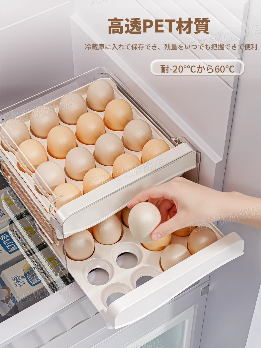 家庭用卵収納ボックス|キッチンにぴったりの仕切り付き卵トレー|引き出し式冷蔵庫用卵ケース|鮮度保持&整理整頓の必需品!